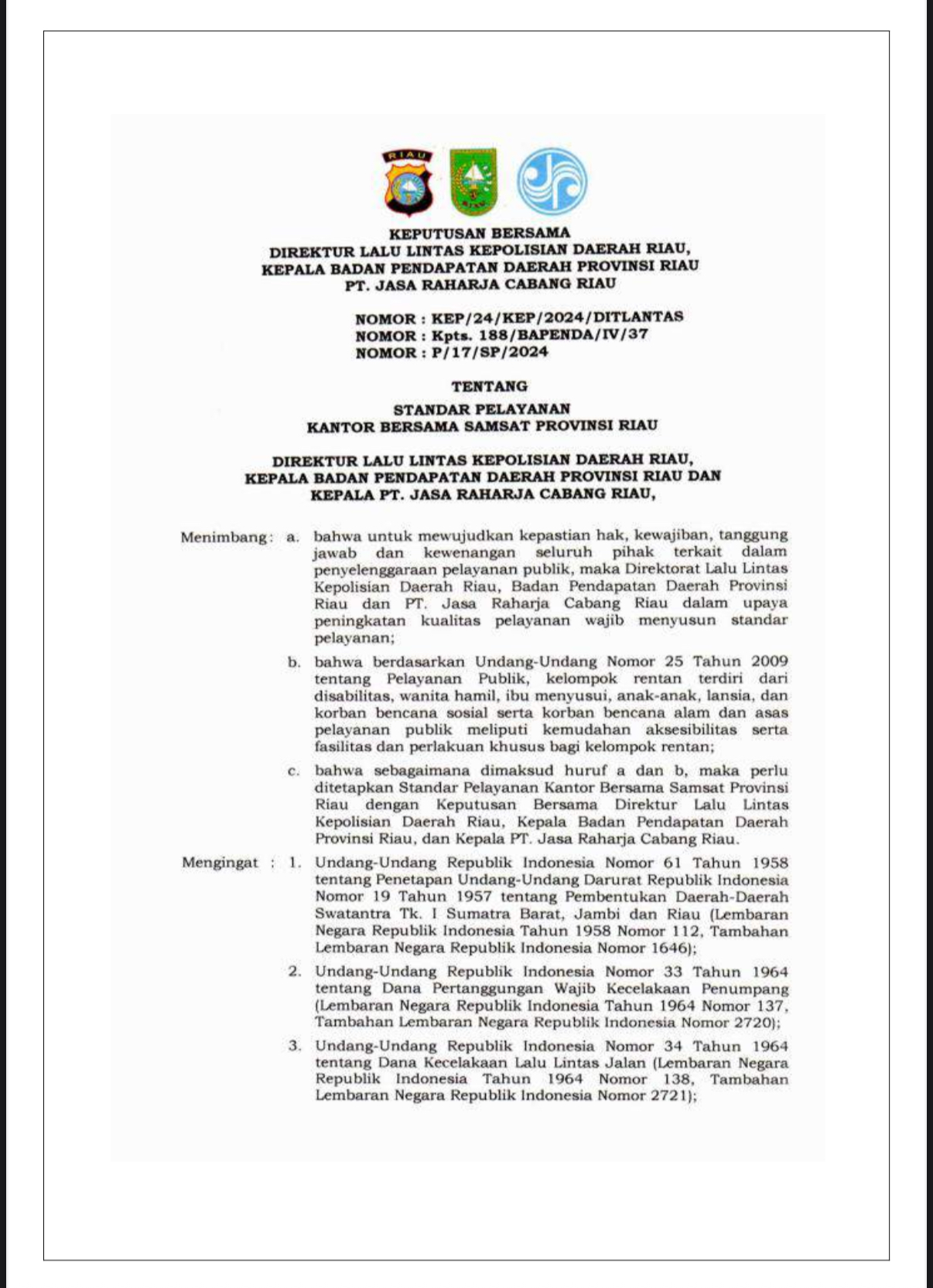 tim pembina samsat riau menandatangani kesepakatan bersama terkait standar pelayanan kesamsatan tahun 2024 SELENGKAPNYA