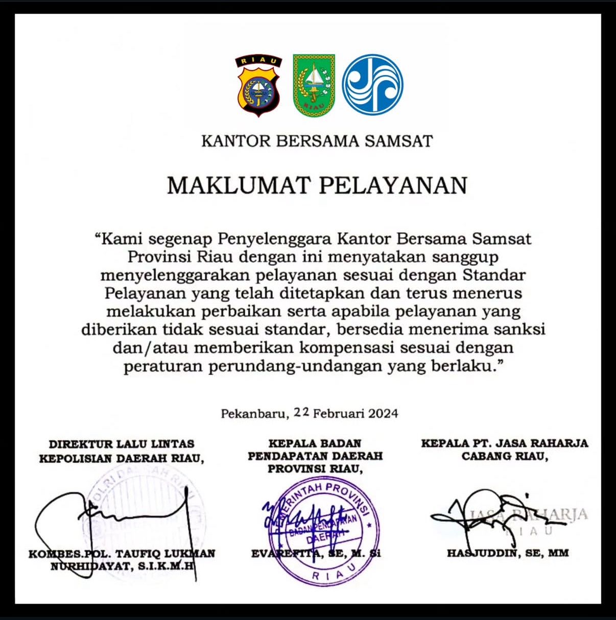 Tim Pembina Samsat Provinsi Riau Tandatangani kesepakatan Standar Pelayanan Kesamsatan tahun 2024. SELENGKAPNYA